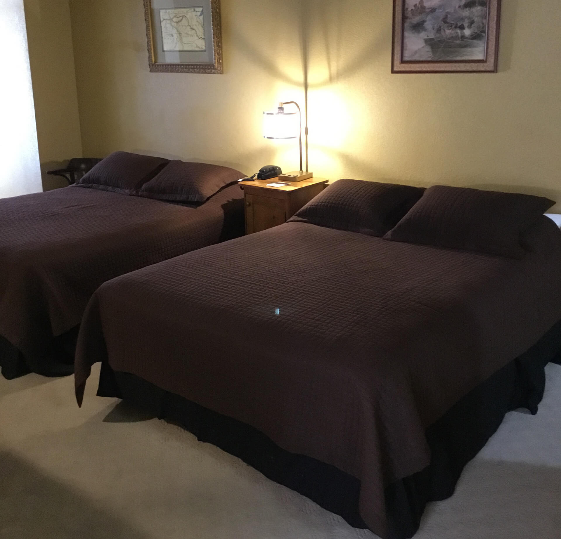 Our Deluxe Double Queen rooms include two queen-size beds, TV and a private restroom with a shower. Occupancy for up to FOUR people. Extra persons add $25/person/night. Maximum number of adults is 4. Minimum age requirements: Must be 21 or older to book this room.