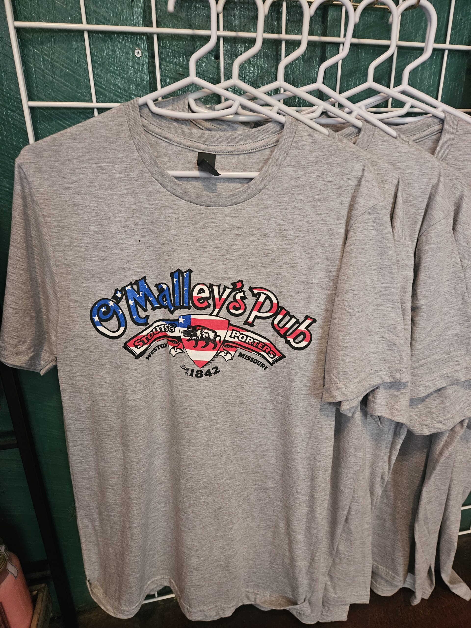 Soft, cotton t-shirt featuring the O’Malley’s Pub logo filled in with the American flag.